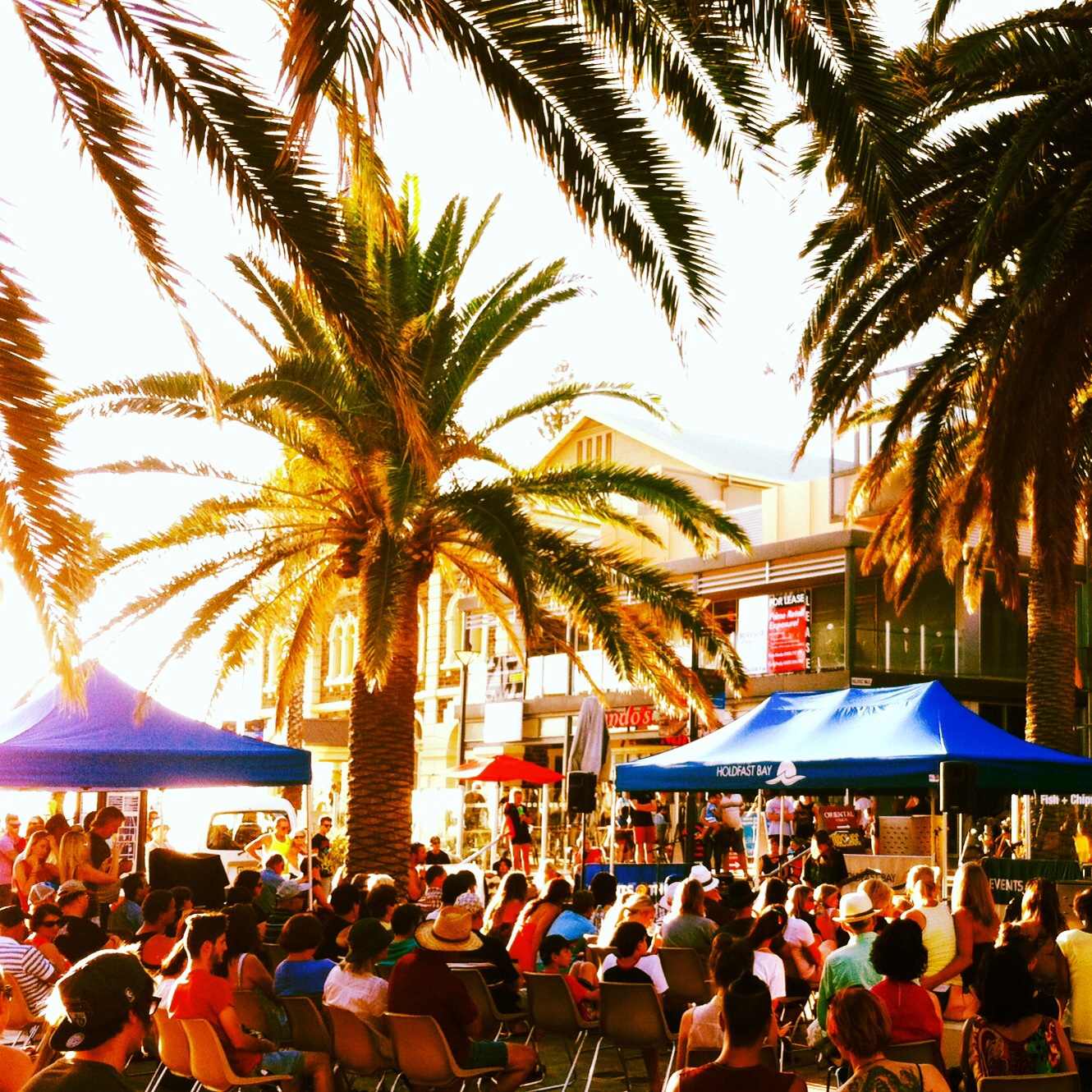 A late summer early evening, the sun sinking into St Vincent’s Gulf, its rays washing over everyone and everything with liquid gold, the carefree chatter of friends around you, the thrum of acoustic guitars and melodic voices. Sometimes it’s possible to believe that Moseley Square in Glenelg is the most beautiful location on earth. Especially today when Open Mic Glenelg (OMG) is on.
