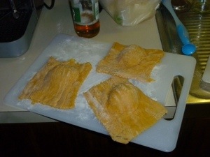 It was a quiet Saturday but K had the idea to make our own pasta. Being Adelaide, of course, friends dropped by, and so before we knew it, we had a pasta production line and party. As we hadn’t made pasta before, the first successful rolling caused much celebration. The pasta was giant ravioli filled with fresh produce from the Central Markets and served with butter, sage and Parmesan cheese.