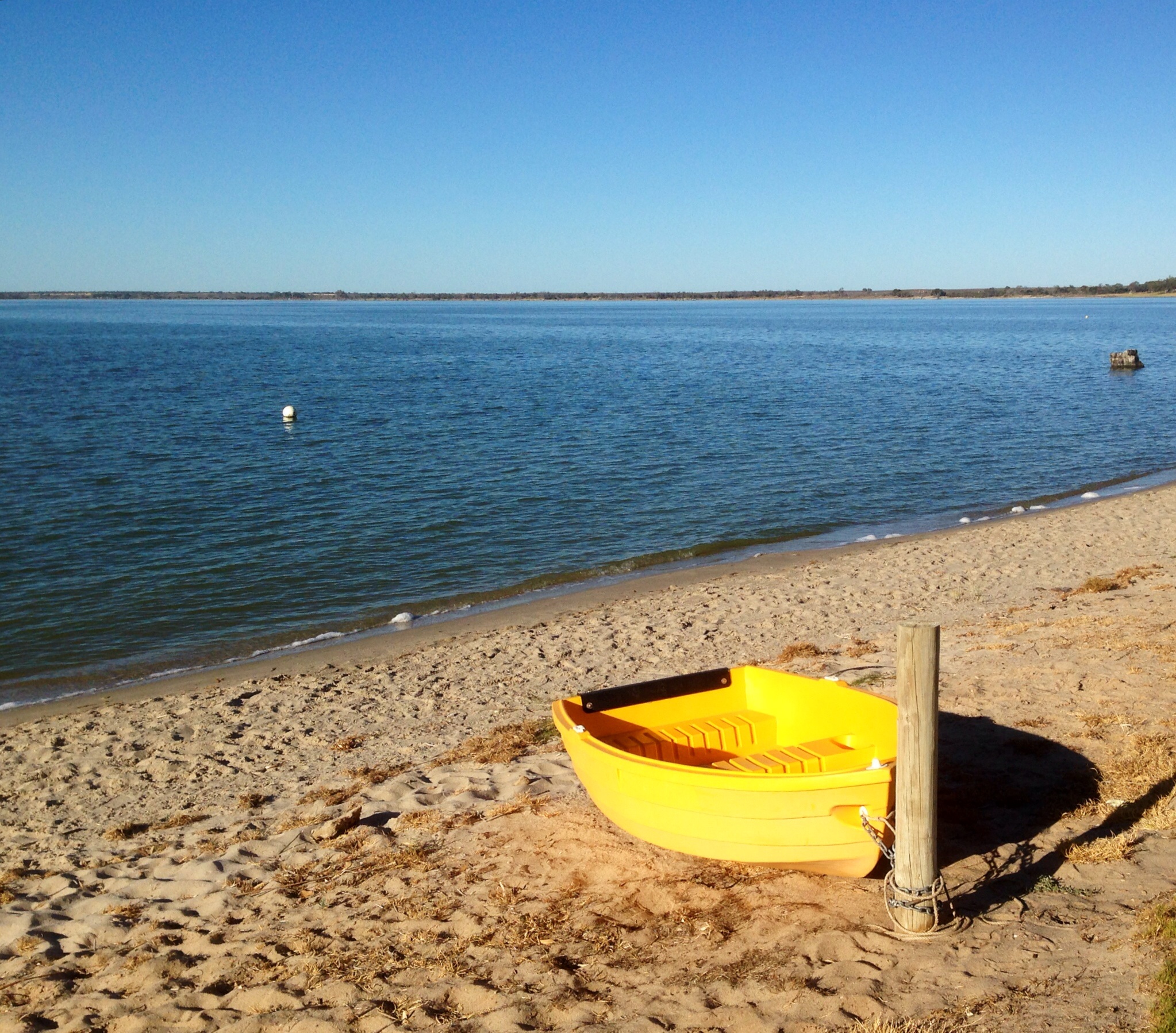 Yellow boat by Lake Bonney in the Murray Riverlands at Barmera. Hundreds of kilometres from the ocean but water is still the predominant element.