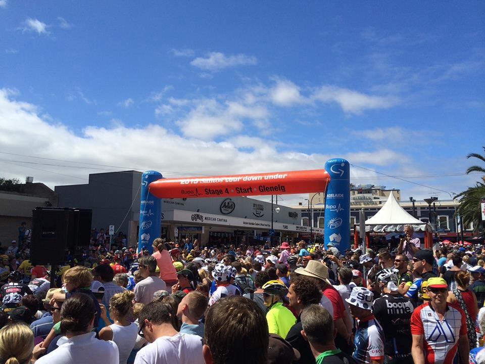 Thousands gathered in Moseley Square for the Glenelg start of stage four of the Tour Down Under. Bikes hung as decorations from every conceivable place as if the whole town had turned into a giant hipster cafe catering for a lycra convention.