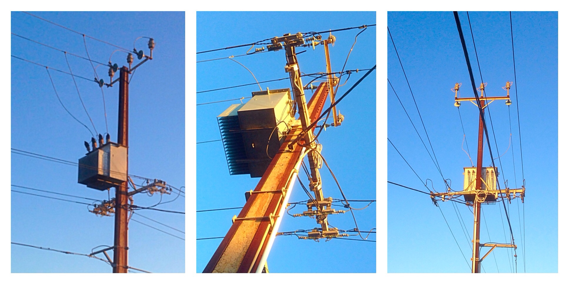 The electrical wires and the “stobie pole” from three angles in the winter sunlight just before sunset.