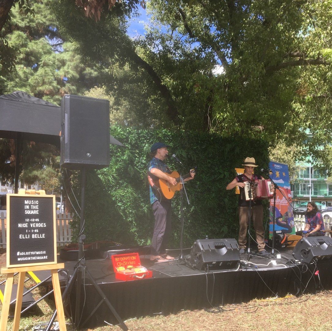 Now that Fringe is over for another year and mad March too, Adelaide life has returned to normal. Fortunately normal includes free lunchtime music in the city’s Victoria and Hindmarsh Squares courtesy of Music SA and the council. A happy throng of lanyard-bearers and the free enjoyed the late summer sun and tunes from the incomparable Wanderers (above) and Latin grooves from Nice Verde (below) showcasing the breadth and depth of the local music scene. UNESCO City of Music, indeed.