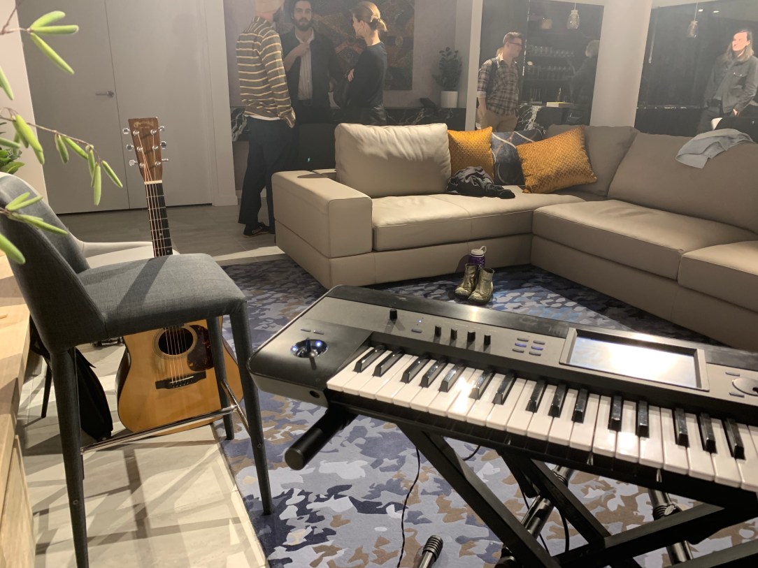 The 24 guests were welcomed with a glass of Champagne before a brief historical and architectural tour of the building. We were then escorted to the presidential suite where an acoustic three-piece incarnation of Wanderers awaited us under the giant TV screen: Dusty on acoustic guitar and lead vocals, Matty on snare drum and an improvised shaker (rice in a water bottle), and Logan on piano.