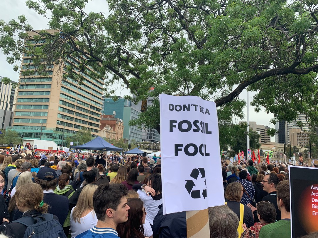 Protesters, many in their school uniform, mustered at Victoria Square, overlooked by the high rise offices of banks, energy and mining companies as well as the Environment Protection Authority and onlookers at the Hilton Hotel. The sound system was as underpowered as the organisers’ expectations were exceeded; speeches and musical performances were hard to hear, but that did not deter the crowd. Socialists and greens milled together with scientists, architects, students, trade unionists, parents, children, grandparents of all origins coming together with surprising order to march up King William Street for a rally outside the State Parliament Building on North Terrace. Placards declared ‘there is no planet B’, ‘don’t be a fossil fool’, ‘denial is not a policy’. Many placards pilloried the Australian Prime Minister, a firm supporter of coal. Other makeshift ones, some carried by very young children, plaintively just pleaded for a future.